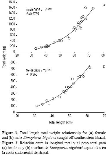 Se encontró que los machos pesaron significativamente menos que las hembras de la misma talla, probablemente debido a los mayores requerimientos de biomasa para el proceso reproductivo de las hembras (gónadas, úteros y embriones) y, posiblemente, a un incremento en el peso del hígado en adultos como almacenamiento energético para la reproducción. Gianetti (2005), sin embargo, no observó diferencias entre sexos en las relaciones pesotalla de E. bigelowi en aguas del sur de Brasil y proporcionó una sola relación para machos y hembras. Una posible razón para esta discrepancia puede ser las diferencias en los intervalos de talla analizados en cada estudio, ya que la mayoría de los especímenes examinados por Gianetti (2005) fueron jóvenes mientras que en el presente estudio se analizó una mayor proporción de especímenes adultos y de mayor tamaño.