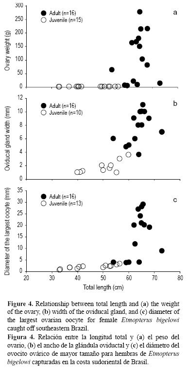 La talla de primera madurez de E. bigelowi en aguas sudorientales de Brasil se estimó en 56.0 cm para hembras y 45.1 cm para machos con base en las ojivas de madurez. Estos valores fueron corroborados con observaciones macroscópicas del desarrollo de los órganos reproductivos, tal como el aumento rápido del peso ovárico y el diámetro de los ovocitos en hembras mayores que 60 cm LT, y el crecimiento relativo de los claspers y el agrandamiento de los testículos en machos mayores que 45 cm LT. Se encontraron diferencias significativas entre sexos y este tipo de dimorfismo sexual en cuanto a la talla de madurez es común en peces elasmobranquios, con las hembras generalmente madurando después y a tallas mayores que los machos (Springer y Gold 1989). Esto ya ha sido descrito para otras especies del género Etmopterus, tal como E. princeps (Jakobsdottir 2001), E. baxteri (Irvine et al. 2006), y E. spinax y E. pusillus (Coelho y Erzini 2005). Aun así, fue interesante notar que a pesar de que la talla de madurez fue significativamente diferente entre machos y hembras, ambos sexos maduraron a alrededor de 75% de las tallas máximas observadas, un valor que parece ser común para peces elasmobranquios (Cortés 2000).