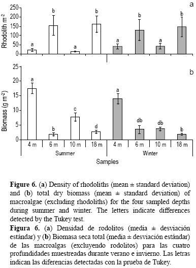 La biomasa media total (peso seco) de las macroalgas (excluyendo los rodolitos) osciló entre 1.88 g m2 (menor) en invierno a 18 m de profundidad y 17.38 g m2 (mayor) en verano a 4 m de profundidad. El ANOVA de dos vías mostró diferencias significativas tanto entre estaciones como entre profundidades. Las muestras recolectadas en verano presentaron una mayor biomasa que las de invierno y se observó una tendencia de mayor biomasa a 4 y 10 m (fig. 6b).