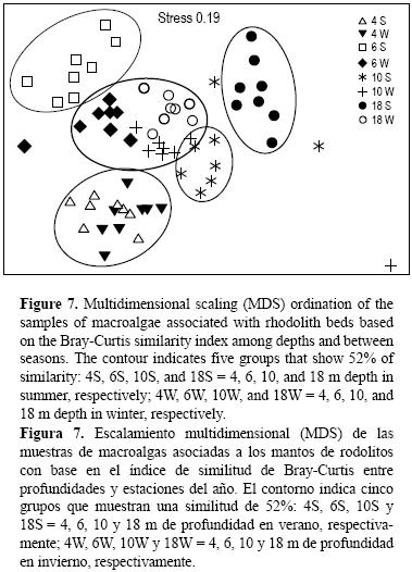 Las comunidades asociadas con los mantos rodolíticos fueron significativamente diferentes en cuanto a profundidad y estación del año (ANOSIM, R = 0.745, P < 0.01; R = 0.514, P < 0.01, respectivamente). Entre las profundidades, sólo a 4 m no se encontraron diferencias entre estaciones (R = 0.249, P > 0.05). El valor de tensión asociado con la gráfica final de MDS (0.19) indicó que la solución final resultó útil para explicar la relación entre estaciones y profundidades (Clarke y Warwick 1994).