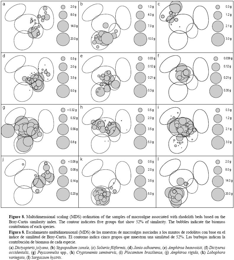 La inestabilidad del sustrato puede explicar las diferencias detectadas por el análisis multivariado. En invierno, cuando la riqueza de especies y la biomasa decrecieron, las unidades de muestras recolectadas a 6, 10 y 18 m de profundidad se agruparon. En verano, cuando la riqueza de especies y la biomasa incrementaron, las unidades de muestras se agruparon de acuerdo con la profundidad. Las especies responsables de las diferencias entre profundidades en el verano fueron las algas carnosas que pueden desprenderse o romperse durante la rotación del rodolito (Dictyopteris jolyana, Solieria filiformis, Jania adhaerens y Amphiroa rigida; fig. 8). En invierno, sólo las especies con talos pequeños (Cryptonemia seminervis, Peyssonnelia spp. y Plocamium brasiliense; fig. 8) permanecen unidos a los rodolitos y, por lo tanto, no se oberva una zonación. El sitio de recolección a 4 m de profundidad se localiza en una zona más protegida de las tormentas invernales que los otros sitios. Esto podría explicar el hecho de que no se observaran diferencias entre las estaciones del año a 4 m, caracterizadas por la presencia y abundancia de Stypopodium zonale, Sargassum hystrix y Lobophora variegata (fig. 8).