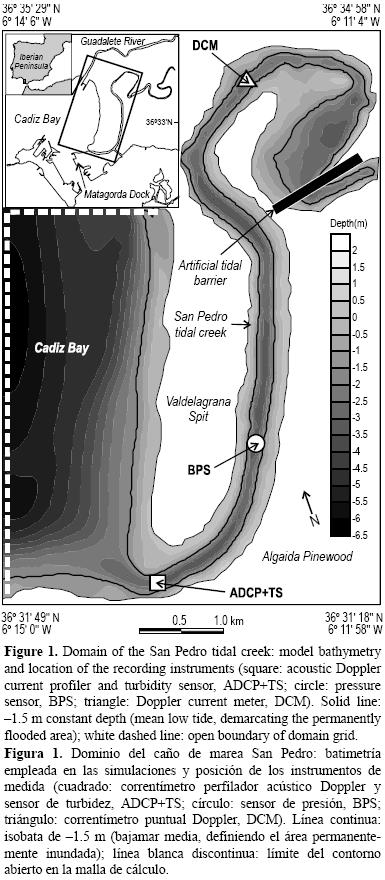 El caño de marea San Pedro, en la Bahía de Cádiz (SW de España, fig. 1), constituye un recinto de aguas muy someras sometido a la hidrodinámica de marea de la bahía y forma parte del sistema de marismas del Parque Natural Bahía de Cádiz. Su hidrodinámica se encuentra influida por la del entorno de la Bahía de Cádiz, caracterizada por un régimen mesomareal, semidiurno y estacionario (Álvarez et al. 1999), donde la elevación alcanza amplitudes de 60 cm en marea muerta y 180 cm en marea viva, con corrientes asociadas de más de 1 m s1 en algunas zonas. La configuración morfobatimétrica del caño se ha visto frecuentemente afectada por las actividades humanas que se han desarrollado en su entorno (construcciones, industria salinera, acuicultura y actividades recreativas, entre otras). La morfología actual es la de un canal semicerrado de 4 m de profundidad media, 10 km de longitud y 150 m de anchura media. El caño se encuentra delimitado lateralmente por la barra arenosa de Valdelagrana en su flanco occidental (de baja pendiente y por tanto con amplias zonas intermareales) y por el pinar de La Algaida hacia el este (de mayor pendiente). En regímenes de marea media, el sistema presenta zonas intermareales a lo largo de ambas orillas, la barra de Valdelagrana y las llanuras situadas al NE junto a la cabeza del caño. Los sedimentos del lecho del caño están principalmente constituidos por arenas finas, con un tamaño medio de grano en torno a 200 µm (Benavente et al. 2006). El sistema presenta actualmente una configuración inestable en la zona de la desembocadura, por lo que el análisis de las propiedades hidrodinámicas y de transporte sedimentario que se presenta a continuación ofrecerá una evaluación de algunos de los procesos que contribuyen a esta situación.