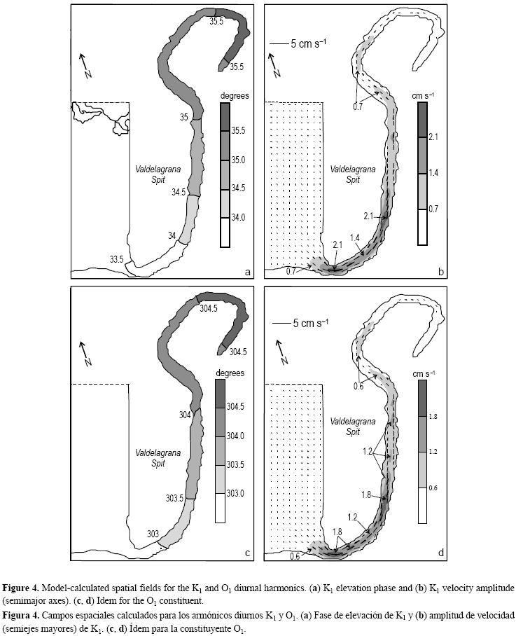 El comportamiento cualitativo de la constituyente S2 simulada es análogo al descrito para la M2. De nuevo, las amplitudes de elevación (fig. 3d) aumentan hacia la cabeza del caño, con amplitudes medias de 33 cm. Asimismo, la fase de elevación (fig. 3e) presenta un retardo de 14 min desde la bocana a la cabeza. La velocidad de la corriente (fig. 3f) está, al igual que en el caso de la M2, cercana a la cuadratura con la elevación, con la misma tendencia cualitativa; dichas velocidades presentan valores máximos en los mismos emplazamientos que para la M2, siendo sin embargo sensiblemente menores que los correspondientes a esta constituyente, en torno a 30 cm s1.