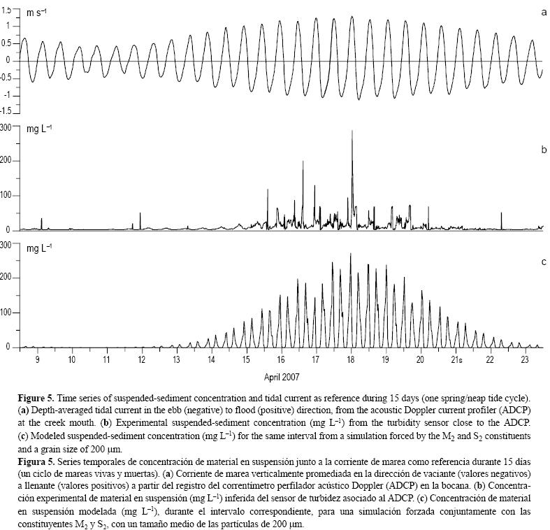 Debido a la escasa contribución de las constituyentes diurnas, las características del transporte de sedimento fueron analizadas forzando el sistema con la superposición de las constituyentes semidiurnas principales M2 y S2 en el contorno abierto, para simular los ciclos de mareas vivas y muertas. La comparación entre los resultados experimentales respecto a los modelados para la concentración vertical media de sedimento en suspensión en el punto en el cual se instaló el sensor de turbidez puede apreciarse en la figura 5. Partiendo de los datos obtenidos a 2 m del lecho del caño, fue reconstruido el perfil vertical de la concentración observada a partir de la ecuación 1 y se obtuvo su valor promedio a lo largo de la columna de agua. La razón de discrepancia media entre los datos observados y calculados puede definirse, de acuerdo con García y Parker (1991), como M = 10A, donde.