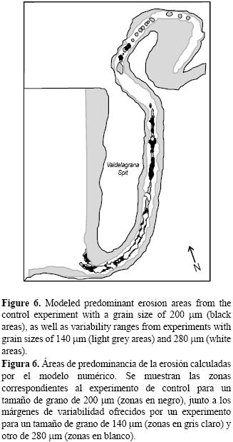 Por otra parte, como se desprende de la comparativa entre los datos observados y calculados, la adecuada elección de la velocidad de fricción crítica es un factor relevante en la caracterización de la magnitud de la concentración de sedimento en suspensión modelada. En este sentido, otros experimentos numéricos de sensibilidad realizados con diferentes tamaños de grano no muestran cambios significativos en las áreas de erosión y colmatación. La principal contribución se produce, de acuerdo a la ecuación 9, en cambios en la magnitud del flujo de sedimento asociados a cambios en la concentración media de sedimento en suspensión, mientras que su orientación depende críticamente de la de la corriente. Por tanto, la incertidumbre que en los resultados puede generar la elección del tamaño de grano está relacionada más con la velocidad de cambio morfodinámico que con las tendencias cualitativas.
