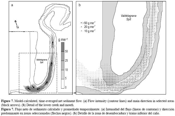 La figura 7 representa dichos flujos netos en cada nodo del dominio, mostrando una marcada tendencia al transporte de material desde zonas tendentes a la erosión a regiones de colmatación. Tres aspectos cualitativos aparecen claramente marcados en la distribución de flujo de sedimento. el primero muestra una tendencia al transporte desde la bocana del caño hacia el curso alto, con valores calculados superiores a 500 g m1 s1; el segundo es que las zonas de mayor transporte se dan en el delta situado en la confluencia del caño con la Bahía de Cádiz, dirigido desde la bocana hacia el exterior del caño con valores similares a los anteriores; y el tercero muestra que se aprecia un proceso erosivo de menor magnitud que los citados (por debajo de 50 g m1 s1) en la región final de la barra arenosa de Valdelagrana, que no obstante favorece el transporte de sedimento desde la barra hacia el interior de caño.