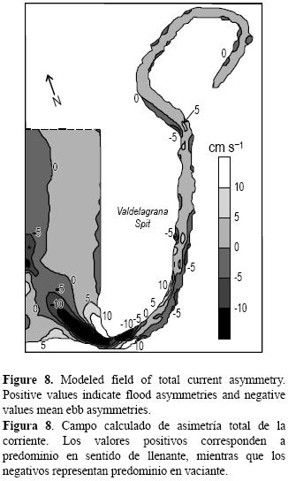 Continuando con el análisis de estas tres tendencias principales, la explicación de este comportamiento puede abordarse a la vista de las asimetrías de la corriente que se generan debido a los procesos de interacción no lineal en el interior del dominio. Tanto en los resultados del modelo como en los experimentales se observan asimetrías en la velocidad de la corriente por la presencia de constituyentes de aguas someras, particularmente la M4 que, al originarse a partir de la onda principal M2, representa la costituyente no lineal mayoritaria en el sistema. Los resultados del modelo numérico respecto a la M4 muestran una elevada concordancia con los registros experimentales (ver tabla 1), lo que avala la representatividad de los mismos en cuanto a la caracterización de las asimetrías descrita a continuación.