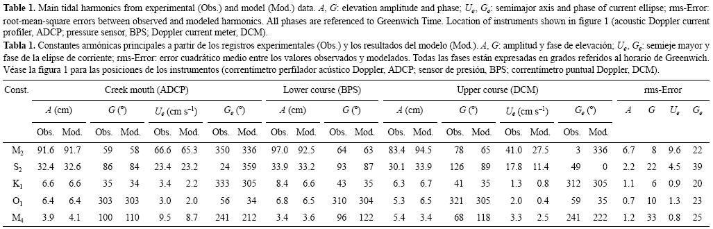 Los resultados del modelo fueron contrastados con los experimentales en las tres estaciones descritas anteriormente tal y como se muestra en la tabla 1, que incluye además los errores cuadráticos medios correspondientes. Como se desprende de los resultados, dichos errores son menores para la elevación de marea que en las corrientes. Los datos del correntímetro Doppler en el curso alto del caño fueron recolectados a una profundidad de 1.5 m sobre el lecho del caño, de manera que la velocidad registrada fuera representativa del comportamiento medio vertical de la corriente horizontal en el mismo emplazamiento. Una estimación de esta profundidad puede realizarse como sigue. Si se supone que la distribución vertical de la velocidad de la corriente en aguas someras puede describirse con un perfil logarítmico, y la dirección de la corriente permanece inalterada en la capa logarítmica, entonces la razón entre la velocidad media vertical u difiere de la velocidad u1, obtenida a una profundidad z1, en un factor dado por u2/u12 ≈ ln2 (H/2.73z0)ln2 (z1/z0), donde H es la profundidad total y z0 el parámetro de rugosidad de fondo. Para el caso H = 2.73z1, se verifica que u2/u12 = 1. Puesto que el correntímetro se encontraba situado a una distancia del fondo z1 = 1.5 m, entonces u2/u12 = 1 para H = 4 m; precisamente ésta es la profundidad del lugar, por lo que la velocidad obtenida por el correntímetro puede considerarse representativa de la velocidad media en la columna de agua. Los resultados de este instrumento, sin embargo, presentan ajustes sensiblemente menores con los datos experimentales que en las zonas cercanas a la boca, con variaciones de 10 cm s1 en las corrientes para la constituyente M2 y de 5 cm s1 para la S2. La razón de este comportamiento se debe a la pequeña anchura del curso en esta zona, que no excede de 100 m, con incertidumbres locales que debido a la resolución de la malla del modelo no son contempladas. En la localización específica del instrumento, las incertidumbres asociadas a la anchura del cauce modelado y la real se sitúan en el 20%, y pueden dar lugar a las diferencias de corriente obtenidas para preservar el flujo neto de agua. Al margen de estas limitaciones, los resultados del modelo pueden considerarse como representativos.