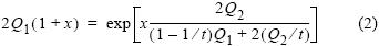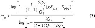 donde Sest es la riqueza de especies asintótica estimada, Sobs es la riqueza de especies observada, es el número de muestras recolectadas, Q1 es el número de especies representadas por exactamente una muestra ("únicas") y Q2 es el número de especies representadas por exactamente dos muestras ("duplicadas"). El número adicional de muestras necesarias para alcanzar el estimador asintótico Chao2 es igual a m = tx*, donde x* es la solución de la siguiente ecuación: