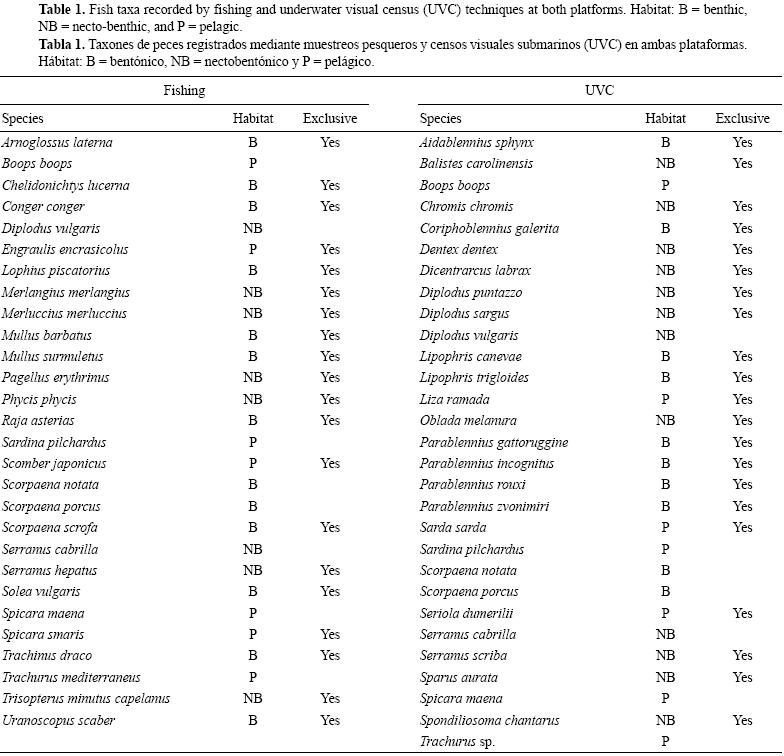 En total, se registraron 45 especies de peces mediante los muestreos pesqueros y los censos visuales submarinos en ambas plataformas gaseras (Eleonora y Squalo C). Se registró un número total de especies comparable (riqueza total de especies) para los muestreos pesqueros (28 taxones pertenecientes a 19 familias) y los censos visuales (29 taxones pertenecientes a 12 familias), aunque sólo se encontraron ocho especies en común (tabla 1). En los conteos visuales, las familias Blennidae y Sparidae fueron las más representativas, con ocho especies cada una.