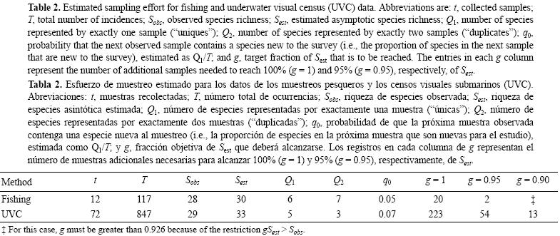 En cuanto a la suficiencia de las muestras para cada método (tabla 2), 12 muestreos pesqueros recolectaron 92% (28 especies) del número total de especies estimado (30 especies), lo cual significa que se necesitarían dos muestras adicionales para alcanzar 95% (g = 0.95) de Sest. Por otro lado, 72 censos visuales detectaron sólo 88% del número total de especies estimado, por lo que se necesitarían 13 muestras adicionales para detectar 95% (g = 0.95) de Sest.