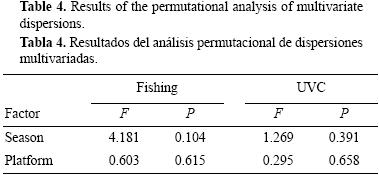 Para ambos métodos, el PERMANOVA demostró que las comunidades de peces difirieron entre las temporadas de muestreo. La comunidad de peces detectada mediante conteos visuales fue diferente en función del factor "plataforma" (tabla 3). El PERMDISP no mostró dispersión significativa para ambos métodos según los factores "plataforma" y "temporada" (tabla 4).