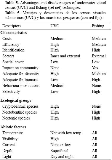 Aunque ambos métodos lograron detectar la variabilidad temporal, sólo los conteos visuales pudieron distinguir los cambios espaciales entre plataformas; sin embargo, las técnicas de censos visuales submarinos presentan ciertas desventajas. La profundidad, temperatura y transparencia del agua, así como las corrientes y el tiempo limitado en el fondo pueden afectar las operaciones de buceo (tabla 5). En particular, el observador generalmente dispone de tiempo limitado y los datos recolectados no se pueden revisar. Algunos factores relacionados con los observadores pueden afectar la localización e identificación de especies in situ. Además, la presencia del buzo puede afectar considerablemente el comportamiento de algunas especies. No obstante, los censos visuales también presentan varias ventajas en comparación con los muestreos pesqueros usando redes. Como ya se mencionó, la detección eficaz de peces bentónicos que se refugian dentro de arrecifes sólo es posible mediante observaciones in situ. Además, el método de censos visuales empleado (conteo de puntos móviles) es adecuado para recolectar datos tanto cualitativos (diversidad, composición y distribución espacial de especies) como cuantitativos (densidad y estructura de tallas); de hecho, el tamaño del área muestreada se conoce y establece antes del censo. La razón del número de individuos censados por área muestreada permite cuantificar la densidad de especies. El uso de artes de pesca estáticos, tal como redes fijas, también permite obtener datos cualitativos y cuantitativos, pero no permite calcular la superficie (o volumen) del área muestreada. Por tanto, debido a los datos complementarios que proporcionan, podría ser ventajoso emplear de forma conjunta técnicas de censos visuales y de muestreo directo, especialmente cuando se pretende caracterizar toda la comunidad de peces (Relini et al. 1995).
