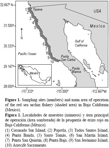 Se seleccionaron 10 localidades de muestreo a lo largo de 350 km de la costa occidental de Baja California, desde las Islas Coronado hasta Punta San Carlos (fig. 1). Para seleccionar las localidades se consideró el historial de sus capturas, su situación geográfica (costa/islas) y características particulares, que incluyen la presencia de macroalgas y depredadores (PalleiroNayar 2009). En cada localidad se ubicaron aleatoriamente 10 transectos de 10 × 2 m (20 m2). Para seleccionarlos al azar, se enumeraron todas las estaciones de muestreo disponibles de campañas anteriores (PalleiroNayar 2004) y se generaron 10 números aleatorios para ubicar los 10 transectos en cada localidad. La densidad y la estructura de tallas de la población se estimaron mediante buceo autónomo y en cada transecto se contaron y midieron todos los organismos in situ, utilizando un vernier con precisión de ±0.1 mm. Los datos se separaron en dos grupos ontogénicos: (1) reclutas, definidos como los erizos de talla <5 mm (los más pequeños que se pueden medir bajo el agua) y <40 mm de diámetro del caparazón (Tegner y Dayton 1977), y (2) adultos, los erizos <60 mm de diámetro de caparazón, que corresponde a la talla a la cual el 50% de los organismos presentan la madurez sexual (PalleiroNayar 2004). Se consideró para los reclutas una talla máxima de 40 mm debido a que es la máxima talla observada bajo las espinas de los erizos adultos en Baja California (PalleiroNayar 2009). En los muestreos se buscó exhaustivamente la presencia de reclutas de erizo rojo bajo las rocas, en hendiduras y en oquedades, evitando remover las rocas para no destruir o alterar el hábitat. Los muestreos se realizaron de agosto a diciembre de 2005, a profundidades que variaron entre 5 y 15 m. El sitio más somero fue la Isla San Martín (5 m), mientras que la Isla Coronado Sur, San Quintín y Punta Baja presentaron una profundidad de 10 m y las seis localidades restantes una profundidad de 15 m.