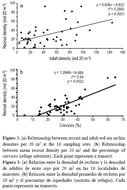 Para analizar la relación entre la densidad de reclutas y el porcentaje de oquedades como sustrato de refugio, se aplicó un modelo de regresión lineal simple, con los datos de todos los transectos de las 10 localidades. También se determinó la relación entre la densidad de reclutas y la densidad de adultos de erizo rojo mediante un modelo de regresión lineal simple. Se usó un modelo de regresión múltiple para observar la interacción de las dos variables independientes con la densidad de reclutas.