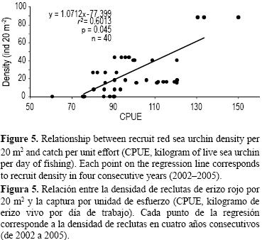 Para evaluar la variación entre la densidad de reclutas de erizo rojo y el efecto de la pesca, se utilizó un modelo de regresión lineal simple con dos variables: la densidad de reclutas del año 2005 de cada localidad como variable dependiente y la captura por unidad de esfuerzo (CPUE, kilogramo de erizo vivo por día de trabajo) de 2002 a 2005 como variable independiente. Los datos de la CPUE se tomaron de las bitácoras de pesca proporcionadas por los propios productores de erizo rojo que operan en las áreas seleccionadas (PalleiroNayar 2009).