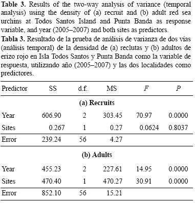 La variación temporal del reclutamiento de erizo rojo en dos localidades se evaluó empleando un ANOVA de dos vías, con la densidad de reclutas como variable de respuesta y la localidad (factor fijo) y el año (factor aleatorio con tres niveles: 2005, 2006 y 2007) como variables predictivas. Para probar la diferencia en la densidad de adultos entre localidades, se realizó previamente otro ANOVA de dos vías, considerando la localidad (factor fijo con dos niveles) y el año (factor aleatorio con tres niveles).