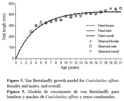 Se han observado diferencias en el crecimiento entre hembras y machos para varias especies de malacántidos. En algunas especies los machos crecen más rápido y alcanzan tallas más grandes que las hembras, pero éstas viven más tiempo (L. chamaeleonticeps, Turner et al. 1983; Branchiostegus japonicus, Hayashi 1976; Caulolatilus chrysops y C. intermedius, Ross y Huntsman 1982). Por el contrario, los machos de C. microps alcanzan tallas más grandes y son más abundantes a edades mayores que las hembras, a pesar de que alcanzan las mismas edades (Harris et al. 2004). Estas divergencias en las tasas de crecimiento están correlacionadas con la madurez sexual en las hembras, probablemente como resultado del costo energético tan alto y temprano de la reproducción (Turner et al. 1983). A pesar de que se han reportado estas diferencias para C. affinis en BLP (ElorduyGaray y RuizCórdova 1998), en CGC no se encontraron y, por lo tanto, fue posible utilizar el MCVB ajustado con los datos combinados.