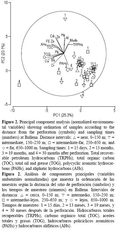 Los cambios temporales y espaciales en la granulometría y química de los sedimentos y en la abundancia de la macrofauna bentónica en los pozos Ballena y Cocuina fueron evaluados con un análisis de gradiente. En cada pozo, las muestras de sedimentos se recolectaron con un nucleador de caja de 0.20 m2 en diez sitios, como se muestra en la figura 1. En cada sitio se realizaron de dos a tres lances con el fin de obtener réplicas independientes para los análisis químicos y del macrobentos. Para poder comparar las muestras químicas y biológicas, las réplicas se agruparon de acuerdo con cuatro intervalos de distancia desde el sitio de perforación: (1) cerca, 0150 m; (2) intermedio, 150250 m; (3) intermediolejos, 250650 m y (4) lejos, 6501000 m; siguiendo un patrón radial. En Ballena, las muestras se recolectaron a los 15 días (T1, agosto de 2005), 13 meses (T2), 19 meses (T3) y 30 meses (T4) después de la perforación. En Cocuina, las muestras se recolectaron antes (T0, julio de 2006) y 15 días (T1, enero de 2007) y 12 meses (T2) después de la perforación.