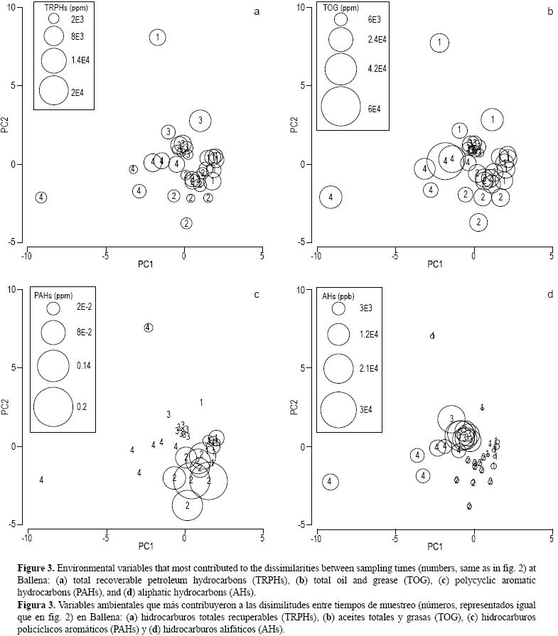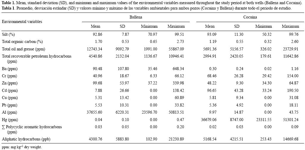 Las variables ambientales se estimaron de acuerdo con la US Environmental Protection Agency (USEPA 2003) y la Convención de OsloParís (OSPAR 2004). En cada una de las muestras se determinaron metales pesados, hidrocarburos aromáticos policíclicos (PAHs, por sus siglas en inglés), hidrocarburos totales recuperables (TRPHs), aceites y grasas totales (TOG), granulometría y carbono orgánico total (TOC), así como seis réplicas para las estimaciones de hidrocarburos alifáticos (AHs). La granulometría se determinó por gravimetría estándar (Folk y Ward 1957) y el TOC por oxidación en presencia de ácido crómico (Jackson 1970). Las muestras de macrobentos se preservaron en formalina al 10% y luego se lavaron a través de un tamiz con malla de 0.5 mm para retener la macrofauna. Todos los organismos se identificaron y agruparon en grupos taxonómicos mayores.