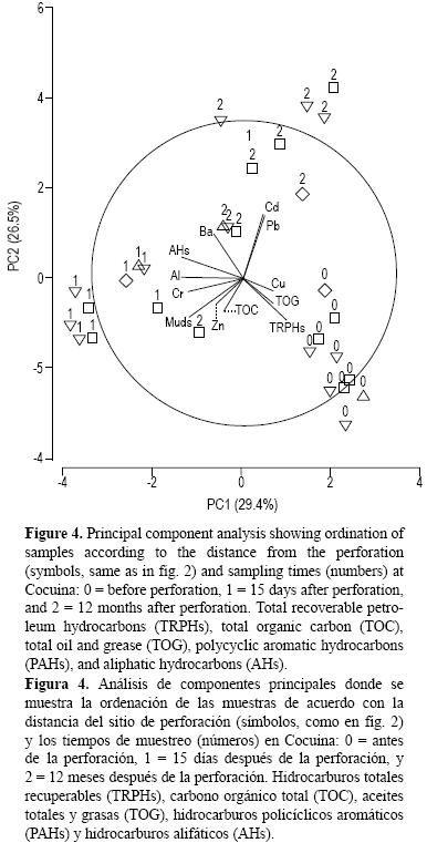 Usando como referencia los niveles registrados para sedimentos de aguas someras de la Plataforma Deltana (Martín y Bone 2007), el Ba fue el único metal tres veces más abundante en Ballena y Cocuina (3437 ppm vs 6999 ppm), pero similar a lo encontrado en otros estudios (12000 ppm, ver revisión en Neff 2005). Otros metales traza asociados a ripios (e.g., Cr, Hg, Pb, Zn) mostraron bajas concentraciones en Ballena y Cocuina comparados a los niveles esperados en áreas con extensiva perforación para hidrocarburos o gas. Las concentraciones de TRPHs fueron tres órdenes de magnitud mayores en Ballena (4464 ppm) y Cocuina (2995 ppm) comparadas con los niveles promedio en la Plataforma Deltana (49 ppm). De forma similar, las concentraciones totales de PAHs fueron un orden de magnitud mayor en Ballena (0.04 ppm) y Cocuina (0.02 ppm) comparado con el nivel promedio encontrado en la Plataforma Deltana, el cual rara vez excedió los límites de detección (i.e., 0.001 ppm; Martín y Bone 2007).