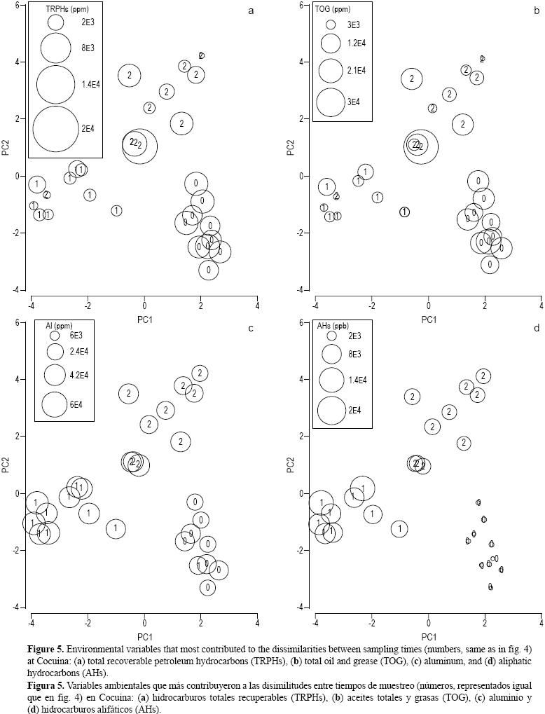 En Cocuina las muestras también se agruparon claramente según su tiempo de muestreo (fig. 4), con las mayores diferencias entre T0 y T1 (tabla 2); TRPHs, TOG, Al y AHs fueron las variables que mejor explicaron los cambios temporales en la química del sedimento (tabla 2, fig. 5ad). Los sedimentos en T0 tuvieron los niveles más bajos de AHs (fig. 5d), los cuales incrementaron en T1 junto con los de Al (fig. 5c). Los niveles de TOG y TRPHs disminuyeron entre T0 y T1, pero ambas variables tuvieron concentraciones aún apreciables en T2 (fig. 5a, b). Se observó una correlación positiva entre TOG y TRPHs, pero éstos presentaron una asociación negativa con AHs y Al (fig. 4). Además, el contenido de metales como el Zn, Cr y Al estuvieron positivamente correlacionados a los limos y TOC en los sedimentos (fig. 4).