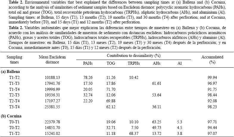 En Cocuina, la disimilitud más alta en la abundancia de fauna se presentó entre T0 y T1 (tabla 3). Aquí, la abundancia de cada taxón rara vez superó los tres individuos por muestra, sin importar la distancia al sitio de perforación o el tiempo de muestreo. Sin embargo, los poliquetos dominaron la comunidad y fueron los que mejor explicaron las diferencias entre tiempos (5661%, tabla 3).