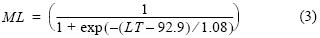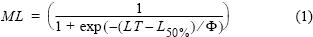 donde ML es la proporción de individuos maduros a la LT (cm), L50% es la longitud a la que el 50% de los individuos ha alcanzado la madurez sexual (tamaño medio de madurez) y Φ es la pendiente de la curva. La diferencia entre esta relación y los sexos se probó mediante la aplicación de un análisis de covarianza (ANCOVA). La estimación de los parámetros y sus intervalos de confianza se obtuvieron utilizando una regresión binaria y las rutinas de análisis probit del software Minitab 16.0.