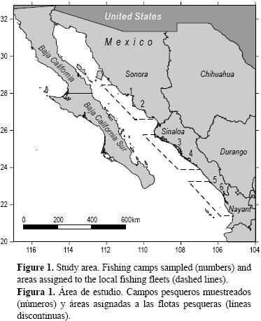 Este estudio fue financiado por el Consejo Nacional de Ciencia y Tecnología (CONACYT, proyecto No. 62546). El primer autor fue beneficiario de una beca doctoral del CONACYT. Agradecemos a los pescadores locales de Sonora y Sinaloa su invaluable apoyo al permitirnos analizar sus capturas. Gracias a C CastilloCastro y los estudiantes del Centro de Estudios Tecnológicos del Mar No. 28 de Altata, Sinaloa, por su colaboración en el muestreo biológico. Se agradece la asesoría de P ValdezLedón en el programa estadístico R.