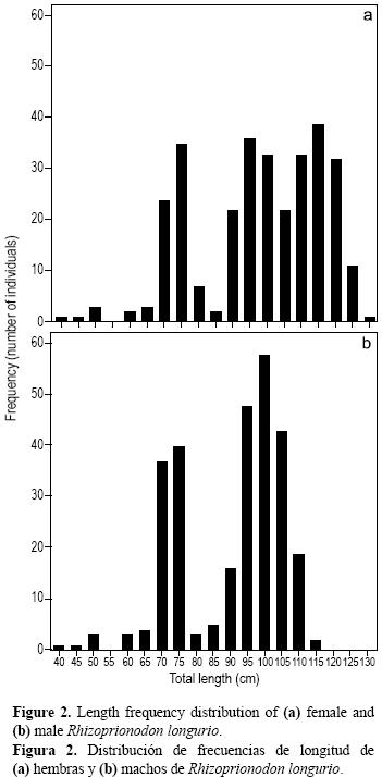 Se encontraron diferencias estadísticamente significativas entre las frecuencias de longitud de machos y hembras (análisis de varianza, P < 0.0005; MannWhitney, Wilcoxon). La talla media de los machos fue de 90.3 cm LT (mínima = 40.0 cm LT, máxima = 112.7 cm LT, n = 283) y la de las hembras fue 97.81 cm LT (mínima = 41.0 cm LT, máxima = 129.0 cm LT, n = 307). En ambos sexos la distribución de las frecuencias de longitud mostró dos modas (fig. 2). Para los machos, las modas se ubicaron a los 75 y 100 cm LT, y correspondieron a jóvenes e individuos más grandes, respectivamente. Para las hembras, las modas se ubicaron a los 95 y 115 cm LT, correspondiendo a individuos grandes.