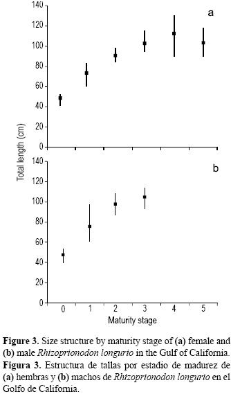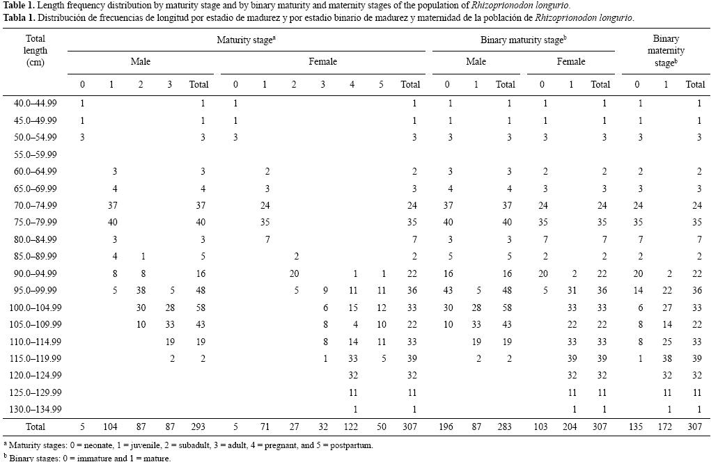 Rhizoprionodon longurio es una especie con importancia económica en la costa continental del Golfo de California. La talla media fue de 90.3 cm LT para machos y 97.8 cm LT para hembras, mientras que la talla promedio de jóvenes y subadultos fue, respectivamente, 75.1 y 97.3 cm LT para machos y 73.1 y 90.2 cm LT para hembras. Se encontraron diferencias estadísticamente significativas entre sexos. La función logística que describió la proporción de machos maduros fue ML = 1/(1 + exp((LT 100.61))/2.57), y la de hembras maduras fue ML = 1/(1 + exp((LT 92.9))/1.08). La incorporación de esta información permitirá aportar información para recomendar medidas de manejo pesquero para la especie. Las áreas de nacimiento y crianza de esta especie deben ser protegidas en los periodos abriljulio y juliodiciembre, respectivamente.