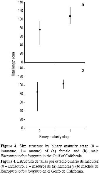 La regresión logística binaria mostró diferencias estadísticamente significativas entre sexos en las ojivas de madurez (ANCOVA, P < 0.001); por lo tanto, los parámetros de la función logística se estimaron por separado. La ecuación que describió la proporción de los machos maduros fue la siguiente: