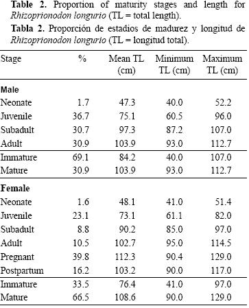 Para asignar las fases o estadios de madurez sexual de R. longurio se siguieron los criterios de Goldman (2004) y MárquezFarías et al. (2005). En los machos esta condición se estimó mediante la observación de la calcificación de los gonopterigios y de su capacidad rotatoria, así como la presencia o ausencia de semen, y se utilizaron cuatro estadios: neonato (0), joven (1), subadulto (2) y adulto (3). En las hembras, la madurez sexual se determinó con base en la observación del estado de desarrollo de los ovocitos, la glándula nidamentaria y la presencia de embriones, y se utilizaron seis estadios: neonato (0), joven (1), subadulto (2), adulto (3), preñez (4) y post partum (5). En machos y hembras las tres primeras fases (02) correspondieron a individuos inmaduros y las restantes a los individuos maduros.