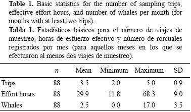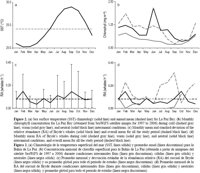 Para los análisis descriptivos y estadísticos, se analizaron los datos de aquellos meses que presentaron al menos dos viajes de muestreo (tabla 1). Estos valores de AR se agruparon por meses en un "año estándar" y se graficaron para evaluar la existencia de un posible patrón estacional en la ocurrencia de rorcuales de Bryde en la Bahía de La Paz. Posteriormente, estos valores mensuales se agruparon por estación templada (diciembre a mayo) y estación cálida (junio a noviembre), y se efectuó una prueba U de MannWhitney para detectar diferencias significativas en la ocurrencia de rorcuales entre ambas estaciones. A su vez, los valores de TSM y clorofila se agruparon en un "año estándar" y se graficaron para describir el patrón estacional de estas variables ambientales.