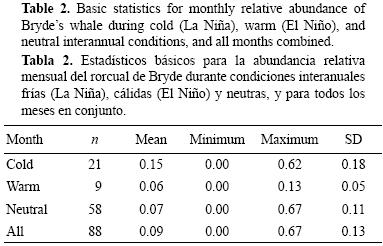 La ocurrencia anual de rorcuales de Bryde no mostró ningún patrón estacional (fig. 2c), y no se registraron diferencias estadísticas en su AR entre estaciones (prueba de MannWhitney: Z = 0.89, P = 0.37, n1 = 45, n2 = 42). La ausencia de un patrón estacional definido también se observó durante condiciones interanuales frías, cálidas y neutrales (fig. 2d); sin embargo, los valores más elevados de AR se registraron durante condiciones frías de La Niña y los valores más bajos durante condiciones cálidas de El Niño (fig. 2d).