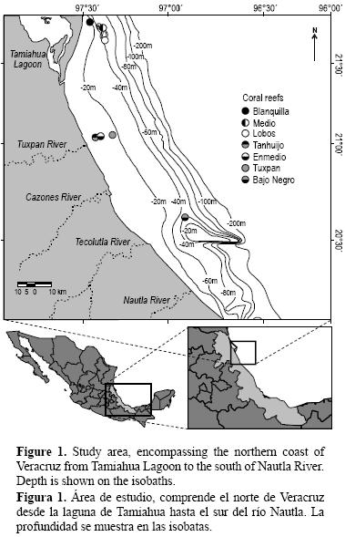 El trabajo de campo se desarrolló en la costa norte de Veracruz, desde la punta Cabo Rojo (21°35' N, 97°19' W) hasta el sur de la boca del río Nautla (20°08' N, 96°40' W), y se cubrió una extensión de 12,000 km2 (fig. 1). El área de estudio es considerada como un hábitat estuarino abierto (QuintanaRizzo y Wells 2001) con una plataforma continental extensa, aguas someras y exposición a eventos meteorológicos como huracanes y tormentas tropicales. La zona es bañada por cuatro ríos (Tuxpan, Cazones, Tecolutla y Nautla) y una laguna costera (Tamiahua). Se reconocen tres temporadas: temporada de secas de marzo a junio, temporada de lluvias de julio a octubre y temporada de nortes de noviembre a febrero (Schultz et al. 1997, ToledoOcampo 2005). Por lo anterior, se consideró el año estacional en vez del año cronológico, así que se cubrieron nueve temporadas: Lluvias05, Nortes0506, Secas06, Lluvias06, Nortes0607, Secas07, Lluvias07, Nortes0708 y Secas08.