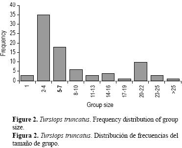 Las toninas que viven en diferentes hábitats pueden formar grupos muy diferentes en tamaño: los grupos grandes se encuentran en aguas profundas y alejadas de la costa (Reynolds et al. 2000, Campbell et al. 2002). En este trabajo, el área de estudio se considera como un hábitat abierto y se esperaba encontrar grupos grandes; sin embargo, se observó un tamaño promedio de ocho individuos, lo cual se encuentra documentado comúnmente en la literatura (Wells y Scott 2002). Es común encontrar 37 individuos en hábitats cerrados como en Texas (Shane 1980), Florida (Wells 1986) y Belice (Campbell et al. 2002), e incluso en el Pacífico mexicano (Morteo et al. 2004), y es interesante que los delfines que se encontraron en las costas del norte de Veracruz mostraran tamaños de grupo que son característicos de un hábitat cerrado. Entonces, se supone que estos delfines pueden modular su comportamiento según las circunstancias ambientales locales.
