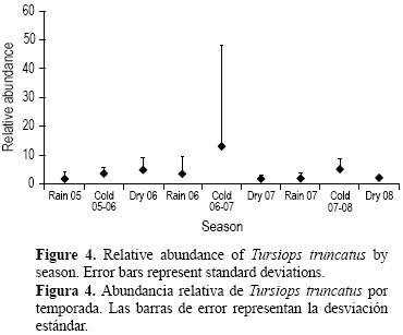 Los grupos de toninas fueron avistados en 76% (n = 45) de todas las navegaciones. Estuvieron presentes a una distancia promedio de la costa de 2.5 km (DE = 2.9, n = 471) y a una profundidad menor que 20 m. La abundancia relativa varió entre 0 y 144 delfines por hora (x = 4.53, DE = 14.3, n = 70) y no se encontraron diferencias significativas entre temporadas (ANOVA, F8 = 0.4459, P = 0.88) (fig. 4).