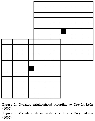 Cada barco está localizado en el centro de su vecindario y cuenta con una percepción o conocimiento local del área de pesca, donde su dinámica está en función del éxito de captura. El vecindario del autómata que se usa para desarrollar la dinámica tradicional es el vecindario de Moore modificado según el vecindario dinámico de DreyfusLeón (2006) para las decisiones de las embarcaciones relativas al posible cambio de área de pesca (fig. 1). Para esto último, el barco se encuentra en el centro del vecindario (super celda de 11 x 11) y el vecindario no es un espacio fijo en el mundo simulado, sino que se conforma según la posición de la embarcación. La interacción entre los barcos del vecindario es la base del AC. Esta interacción es considerada como un cambio de información al realizar la captura (DreyfusLeón 2006). En cada vecindario todas las embarcaciones participan para definir el estado o la calidad del vecindario en términos de abundancia del recurso. La opinión de la calidad de las celdas está en función de la captura que hayan obtenido los barcos.