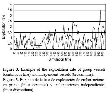 La tasa de explotación (captura en función de la abundancia) se muestra en la figura 3. La tasa de explotación de los dos tipos de embarcaciones fue similar hasta la mitad del periodo de tiempo; después, los barcos en grupo produjeron, en general, una tasa de explotación más alta.