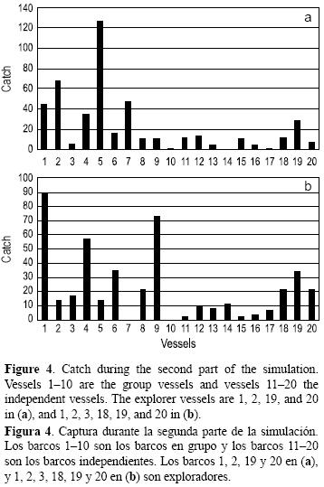 La captura obtenida por los barcos trabajando en grupo (barcos 110) y los barcos independientes (1120) en dos corridas con exploradores para ambos grupos se presenta en la figura 4. Se observa que las unidades con opción de exploración obtuvieron capturas más altas. En el primer ejemplo (fig. 4a), sólo dos barcos en grupo (1 y 2) y dos barcos independientes (19 y 20) fueron exploradores. En el segundo caso (fig. 4b), tres barcos en grupo (1, 2 y 3) y tres barcos independientes (18, 19 y 20) fueron exploradores. En general, la captura obtenida por los barcos con posibilidad de comunicación fue mayor que la de aquellos que trabajaron independientemente. Por otro lado, los exploradores de ambos tipos de barcos obtuvieron mayor éxito en la pesca. Estos cálculos se hicieron para la segunda mitad de la corrida, cuando la abundancia de la UR es menor.
