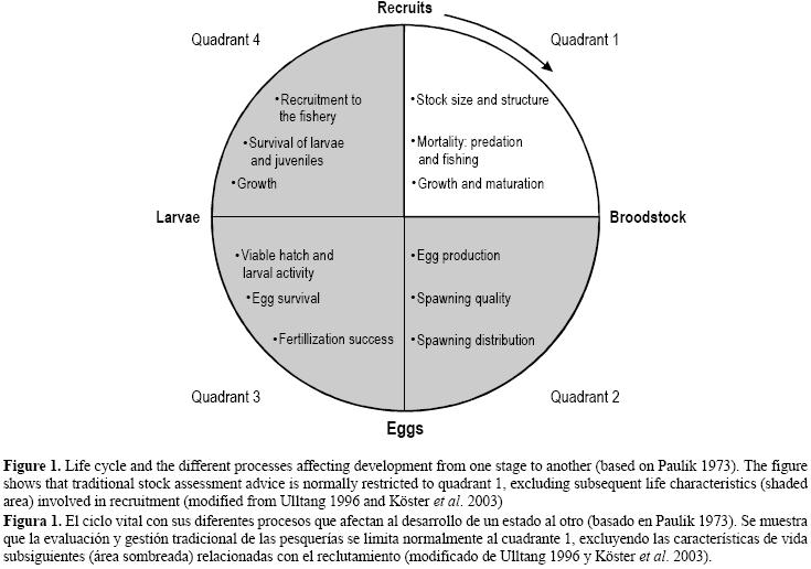A pesar de la discusión actual sobre la relación entre la población adulta y el reclutamiento (Myers 1997, Gilbert 1997, Marshall et al. 2003), la gestión de la mayoría de las poblaciones explotadas de peces se realiza actualmente en base a modelos de "stocks" adultos versus reclutamiento. Los modelos tradicionales de reclutamiento asumen que el potencial reproductivo de la población es proporcional a la población adulta (Trippel et al. 1997), usando parámetros estimados en adultos (fig. 1) para establecer los puntos biológicos de referencia. Los modelos de población adultareclutamiento desarrollados por Beverton y Holt (1957), Ricker (1954) y Shepherd (1982) usaban originalmente el termino de fecundidad (Rothschild y Fogarty 1989, Koslow 1992), pero más tarde éste se reemplazó por el término de biomasa de población adulta (spawning stock biomass en inglés, ó SSB) como aproximación de la fecundidad. En esos casos, se asume que un determinado peso de población adulta tiene la misma probabilidad de generar el mismo nivel de reclutamiento, lo que supone que las tasas de supervivencia de la progenie son independientes de la estructura de edad, tamaño o condición de la población (Cardinale y Arrhenius 2000, Murua et al. 2003) y que la fecundidad total relativa y la producción anual de huevos por tamaños y entre años no varían (Marshall et al. 2003).