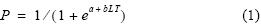 donde P es la proporción de peces maduros por longitud total (LT, cm), y a y b son los coeficientes de la curva logística, intercepto y pendiente, respectivamente.