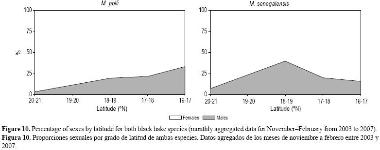 Los ligeros incrementos en la proporción de machos detectados por latitud en las dos especies, dado el sesgo comentado, podrían ser considerados indicadores de las zonas reproductivas (Di Giacomo y Perier 1992, Pájaro et al. 2005) que coinciden además con las áreas de puesta detectadas en este trabajo, que estarían en el sur para M. polli (16°17° N) y en la zona central para M. senegalensis (18°19° N). Un análisis por estrato batimétrico mostraría seguramente con mayor claridad el incremento de los machos a menor profundidad.