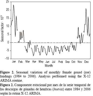 La serie temporal mensual de los desembarcos de huevas mostró una estacionalidad significativa (al nivel de 0.1%) que explica un alto porcentaje de la variabilidad de la serie. Los resultados indicarían la existencia de una época de puesta invernal muy definida entre noviembre y febrero, con un pico en los meses de diciembre y enero, tal y como se observa en la representación gráfica del componente estacional por mes estimado en la serie sobre una media teórica de cero (fig. 2). La rutina X12 ARIMA seleccionó una media móvil 3 × 3 como la mejor estimación del factor estacional.