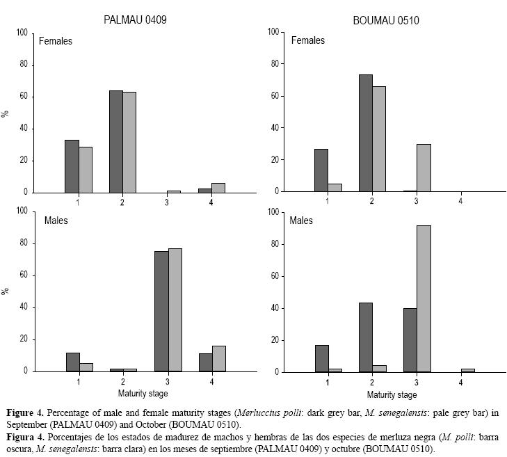 Con el fin de precisar el comienzo del desove se calcularon los porcentajes de los estados de madurez de las dos especies en septiembre de 2004 (PALMAU 0409) y octubre de 2005 (BOUMAU 0510), examinando en el primer mes 662 ejemplares de M. polli y 327 de M. senegalensis, y en el segundo 1211 y 135, respectivamente. Igualmente se estimaron los porcentajes de ejemplares maduros (estados 2 y 3) a lo largo de las campañas oceanográficas MAURIT (tabla 1), de un total de 1872 ejemplares de M. polli y 554 de M. senegalensis.