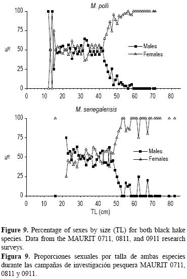 La proporción de sexos (R, machos:hembras) por rangos de talla de 1 cm obtenida de las campañas MAURIT, realizadas en época de puesta, estuvo significativamente a favor de las hembras en las dos especies. En M. polli la R global fue de 1:1.7 (χ2, n = 58, P < 0.001) y en M. senegalensis de 1:1.5 (χ2, n = 55, P < 0.001). Los coeficientes de variación (%) de estas estimaciones fueron algo mayores en la especie costera (2.9) que en la de profundidad (1.8). Por clases de talla las hembras dominaron a partir de 43 cm de LT en M. polli y de 49 cm en M. senegalensis. Hasta esas tallas la R fue más equilibrada con una proporción global aproximada de 1:1 (fig. 9). Se capturaron ejemplares de M. polli desde los 12 cm de LT, y de M. senegalensis desde los 22 cm, a excepción de una hembra de 16 cm. Las tallas máximas en ambos sexos fueron mayores en la merluza costera (82.9 cm de LT en hembras y 67.7 cm en machos) que en la merluza de profundidad (71.1 y 58.5 cm LT, respectivamente).
