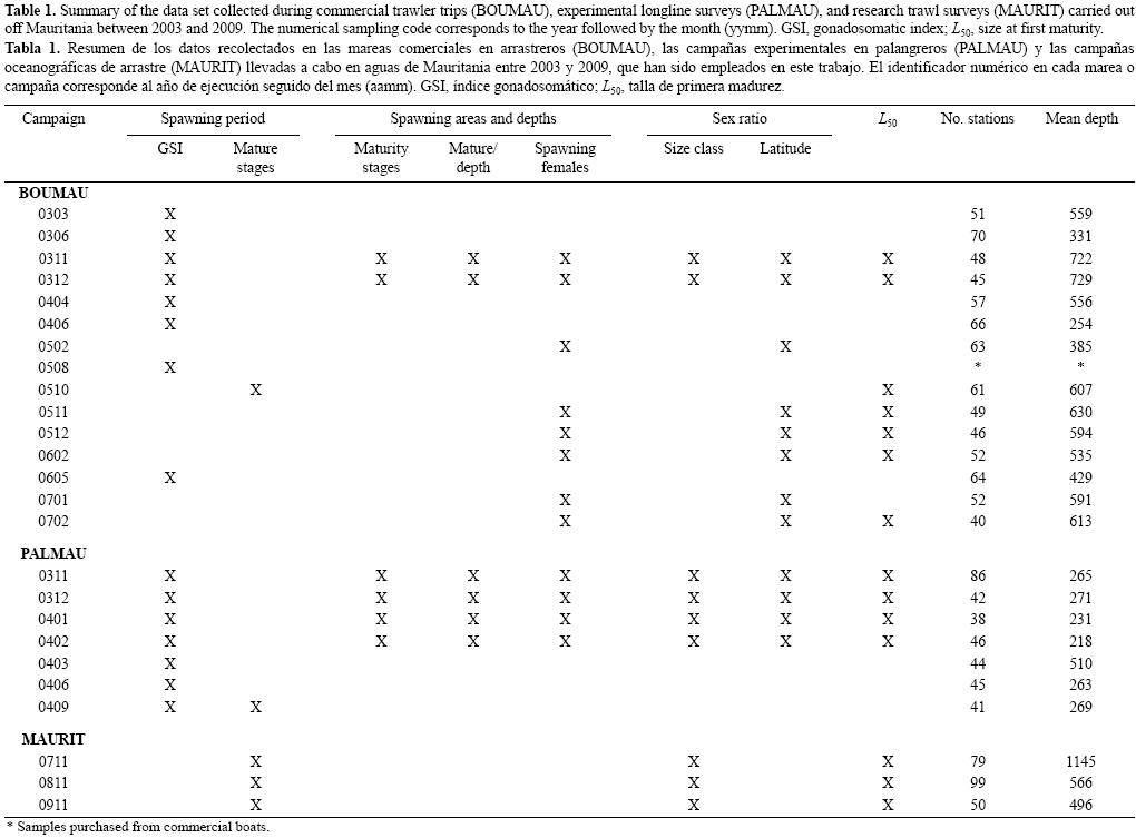 Una parte de los datos se obtuvieron a bordo de buques españoles merluceros de arrastre de fondo, a lo largo de 15 mareas comerciales realizadas entre 2003 y 2007, cuyo acrónimo de serie es BOUMAU. El intervalo batimétrico estuvo comprendido aproximadamente entre los 100 y 1000 m. También se utilizó la información de siete campañas experimentales en buques palangreros, cuyo acrónimo de serie es PALMAU. Dichas campañas fueron realizadas con palangre durante 2003 y 2004, mediante un muestreo sistemático con 15 radiales y cinco estaciones por radial cubriendo toda el área entre los 100 y 1000 m. Para ciertos cálculos se emplearon los datos de tres campañas oceanográficas de arrastre de fondo (Lofoten) cuyo objetivo principal fue la prospección y evaluación de los recursos demersales existentes en los fondos mauritanos. Las campañas fueron realizadas entre mediados de noviembre y de diciembre entre 2007 y 2009 (campañas MAURIT 0711, 0811 y 0911), utilizando un muestreo aleatorio desde la plataforma continental (80 m) hasta el talud profundo (1860 m). La metodología empleada en dichas campañas ha sido descrita por Ramos et al. (2010). En la tabla 1 se muestran las mareas y campañas utilizadas para cada análisis. Se contabilizó un total de 1334 estaciones de pesca georeferenciadas en las que se muestrearon aproximadamente más de 10,000 ejemplares de M. polli y alrededor de 2500 de M. senegalensis. De cada ejemplar se determinó la longitud total (mm), el peso total y eviscerado (±1 g), y, siempre que fue posible, el sexo, el estado de madurez sexual, según una clave de visu de cuatro estados validada histológicamente para la merluza europea por Lucio et al. (2000): 1, inactivo; 2, maduración; 3, puesta, y 4, postpuesta. Se determinó el peso de las gónadas (± 0.1 g) y se conservaron ovarios de ambas especies en distintos estados de desarrollo en formol neutralizado al 4%.