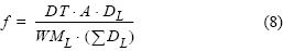 donde DT es la densidad media de peces (t milla náutica2) calculada para toda la campaña y representa la densidad de peces por unidad de superficie de prospectada acústicamente, A es el área reproductiva (milla náutica2), WML es el peso medio de la muestra obtenida en el lance; y DL es la densidad media de peces (t mn2) calculada a partir de los registros acústicos obtenidos a lo largo de la transecta en las inmediaciones del lance L (Macchi et al. 2005). Cabe señalar que para calcular DL se consideraron todos los valores positivos del registro acústico, ubicados por delante y detrás del lance. Los limites en ambos extremos se establecieron cuando se determinó una serie continua de registros con valores nulos.