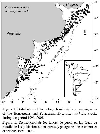 La anchoita argentina (Engraulis anchoita) es la especie ictica de mayor abundancia en el Atlántico Sudoccidental, donde tiene una amplia distribución geográfica desde 23°S hasta 47°49° S. Sus áreas de puesta ocupan, casi en su totalidad, la plataforma submarina a lo largo de dicho rango latitudinal, en una vasta gama de escenarios hidrográficos que incluyen regiones de afloramiento, frentes mixohalinos, de marea y el talud. Esta especie es un importante eslabón en el ecosistema pelágico y constituye la principal dieta de peces de importancia comercial como la merluza, además de aves y mamiferos marinos. Dos stocks o poblaciones de anchoita se reproducen en el Mar Argentino y en el sector del frente marítimo ArgentinoUruguayo (32.55°34.40° S y 57.57°58.23°W), con su punto máximo de puesta durante primavera y verano (Sánchez y Ciechomski 1995). La población bonaerense se distribuye principalmente hasta 41° S, mientras que la población patagónica habita al sur de esta latitud (Hansen et al. 1984). Durante la época reproductiva la especie ocupa aguas costeras y de la plataforma interna, aproximadamente hasta los 100 m de profundidad. Finalizada la reproducción, los individuos realizan una migración trófica desplazándose hacia aguas sobre la plataforma externa y las proximidades del talud (Sánchez y Ciechomski 1995, Hansen 2004).